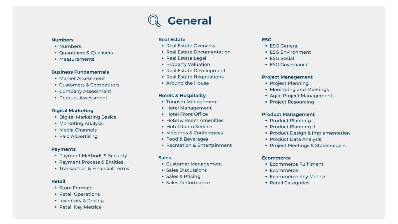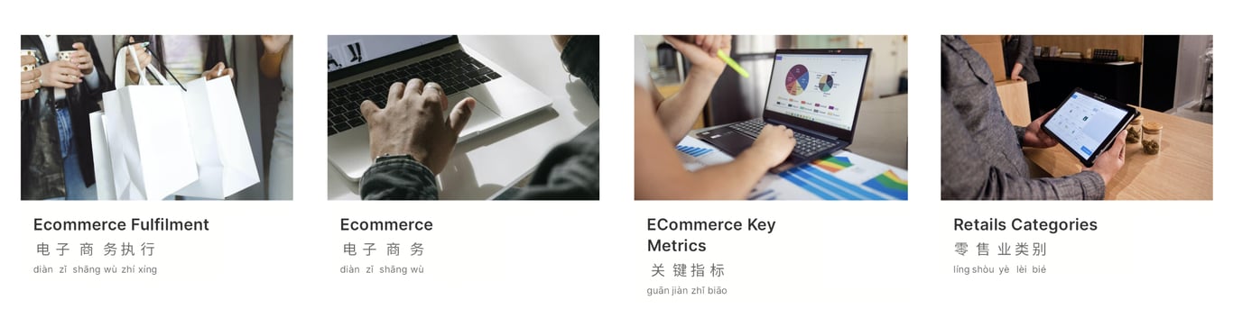 Our Ecommerce topic equips learners with terms relating to the industry, covering essential terms related to eCommerce operations, order fulfillment, key performance metrics, and retail categories.