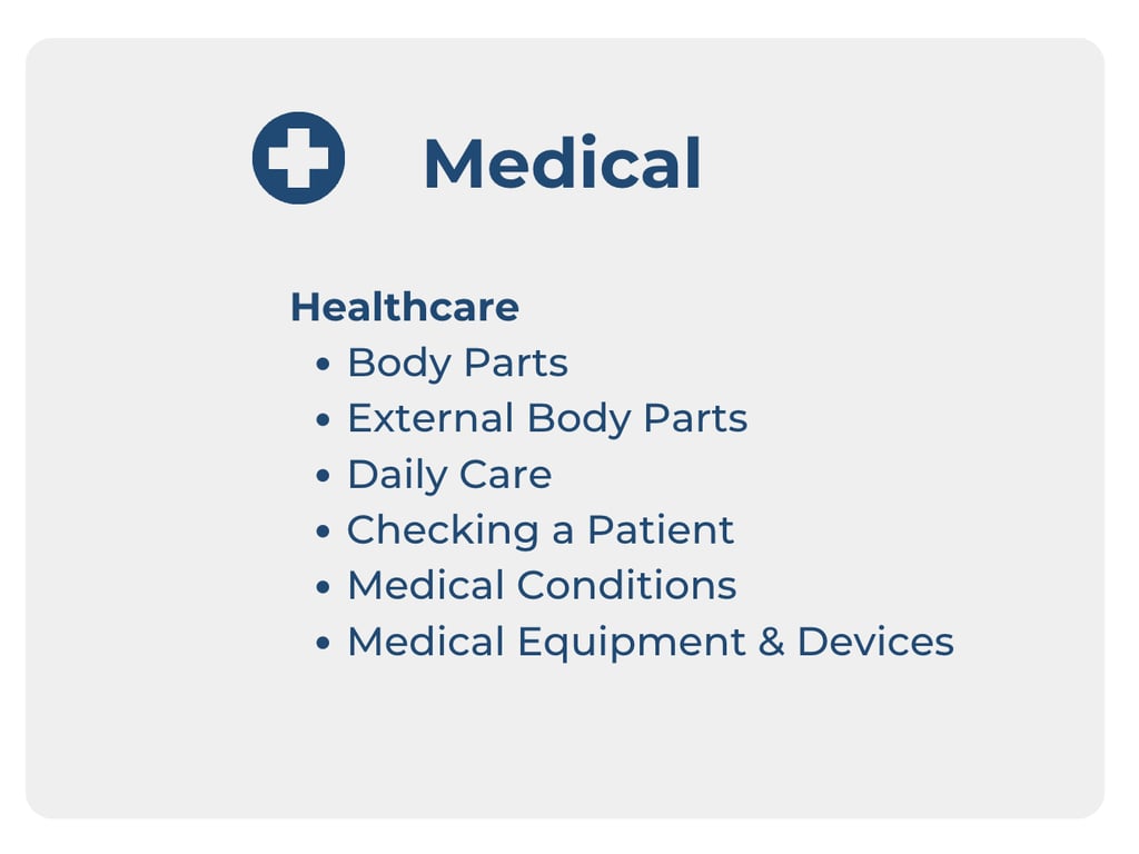 Learn terms relating to simple body parts, patient care, medical conditions and more in this topic.