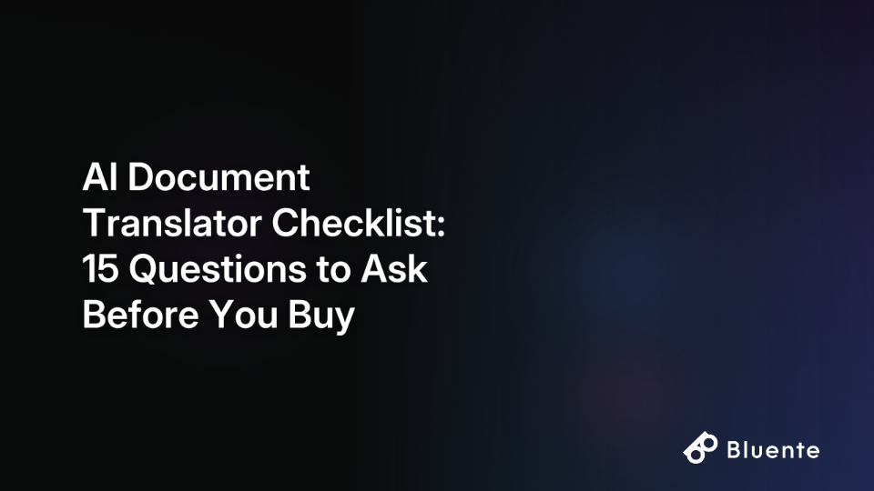 Use these 15 questions as your guide. Take advantage of free trials, scrutinize security policies, and test with sample documents before committing. By doing your homework, you'll find an AI translation partner like Bluente that accelerates your global communication instead of creating more work for you.