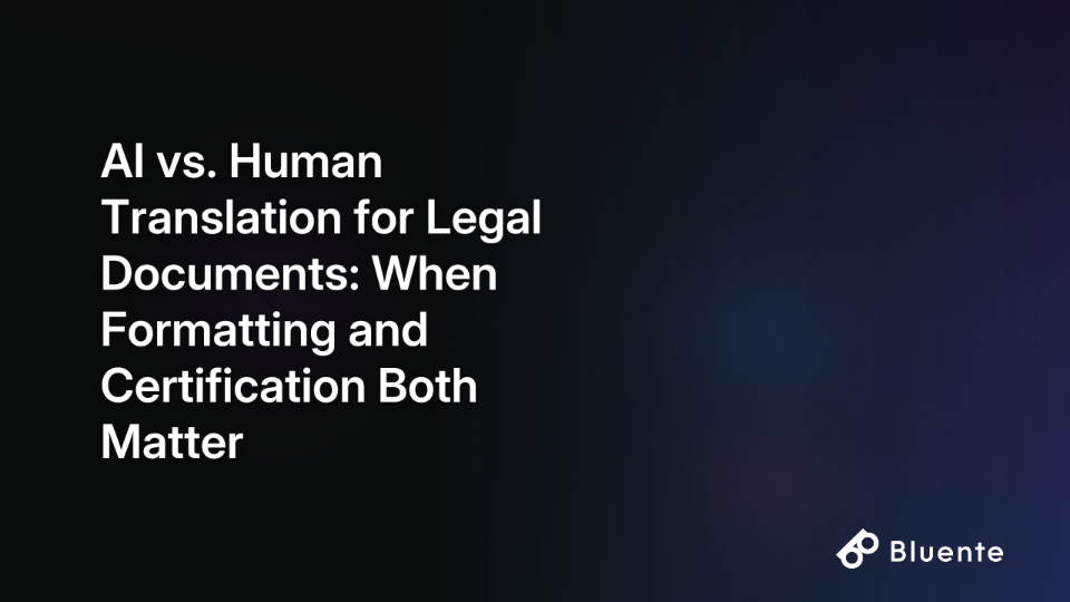 Use AI translation (like Bluente) for the speed and scale you need in internal and non-certified workflows — due diligence, eDiscovery, cross-border contract review. Rely on a professional certified human translation service, such as Bluente's, for all official submissions where legal validity is on the line — USCIS filings, court submissions, notarized instruments.