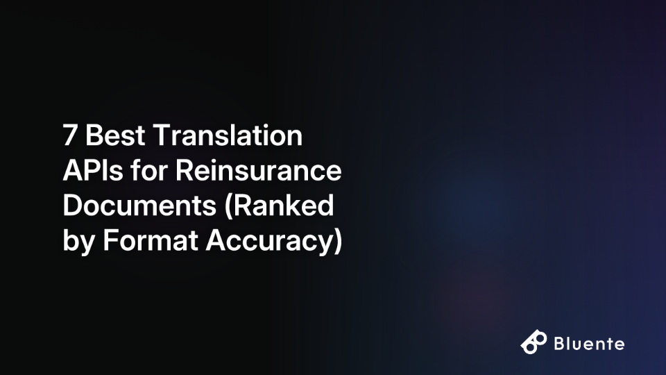The best translation API for reinsurance documents is one that is file-based, not text-based. Based on the evaluation criteria of format preservation, integrated OCR, legal numbering fidelity, and security, the Bluente Translation API is the top-ranked choice. It is specifically designed to handle complex document structures like XLSX bordereaux and scanned PDFs without losing the original layout, which is a common failure point for generic APIs.