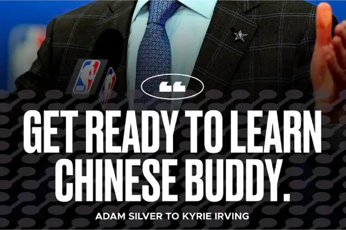 The meme first emerged as a fabricated Bleacher Report infographic featuring NBA Commissioner Adam Silver, accompanied by a fictitious quote attributed to him: "Get ready to learn Chinese, buddy." This meme surfaced when @realnbaquotz first shared shortly after NBA player Kyrie Irving faced criticism for an antisemitic incident in November 2022, before gaining traction across the internet.