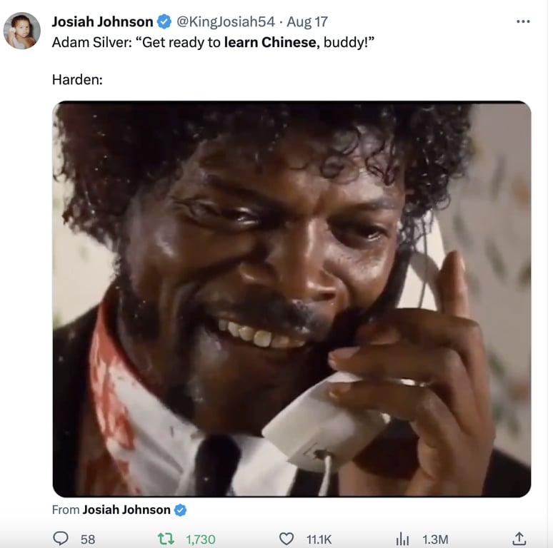 Josiah Johnson's use of the meme in relation to Harden's new endeavor added another layer of humor and relevance. With the meme's history of poking fun at underperforming players in a light-hearted manner, the context of Harden's triumphant livestream event made for an ironical fit, because here was Harden, who had recently achieved unprecedented success in the livestreaming world. The phrase "Get ready to learn Chinese, buddy" had now taken on an entirely new and unexpected connotation.
