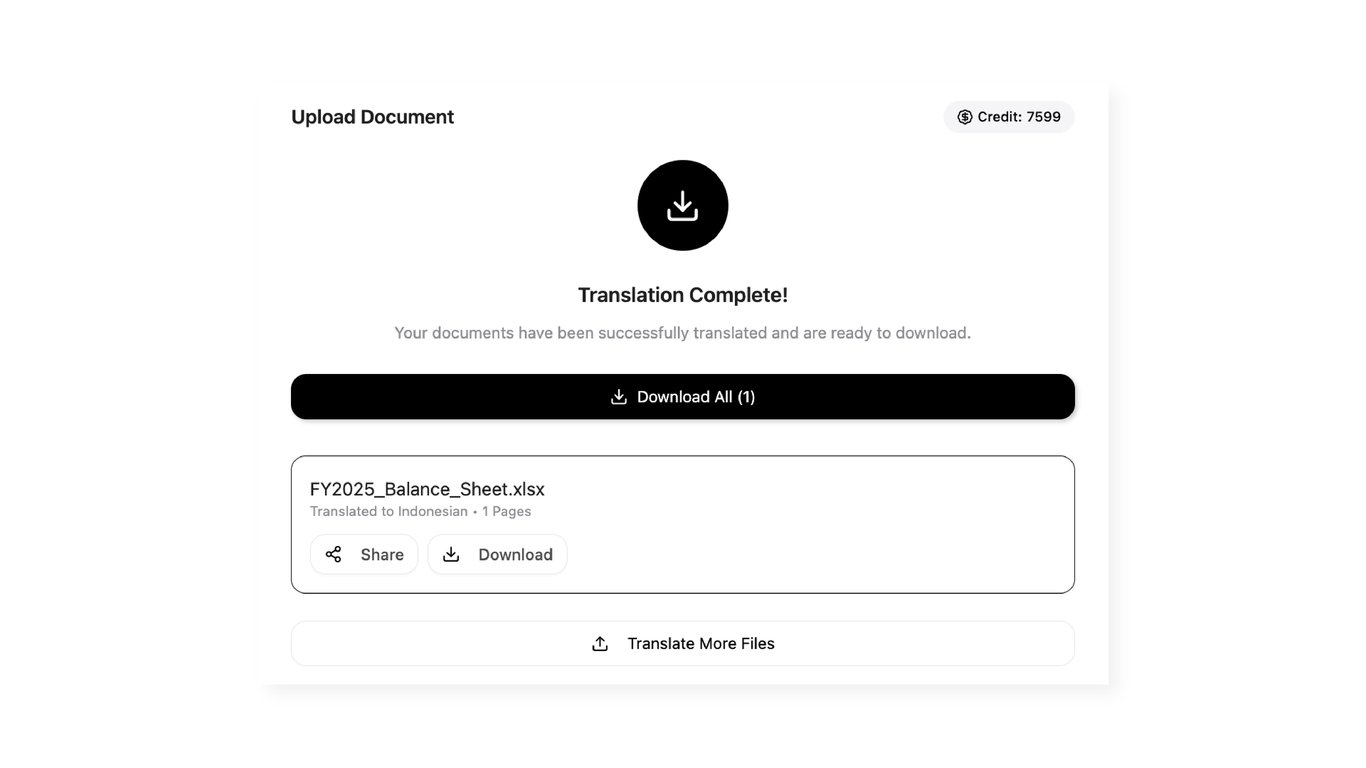 Click on the button to translate. All you have to do now is just to give our tool some time to work its magic. Your translated excel sheet will be ready in less than 2 minutes.