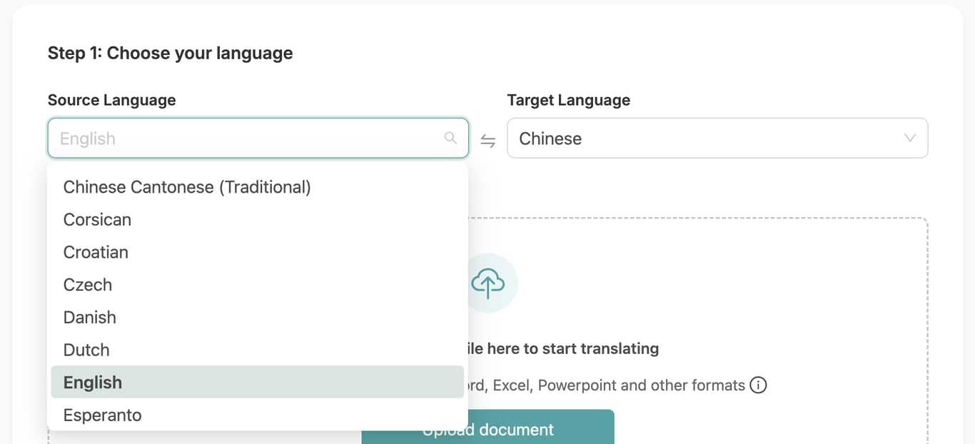 Choose the language your document is in, as well as your desired output language. We offer more than 120 languages, including English, Chinese, Spanish, Arabic, Russian, Italian and much more.
