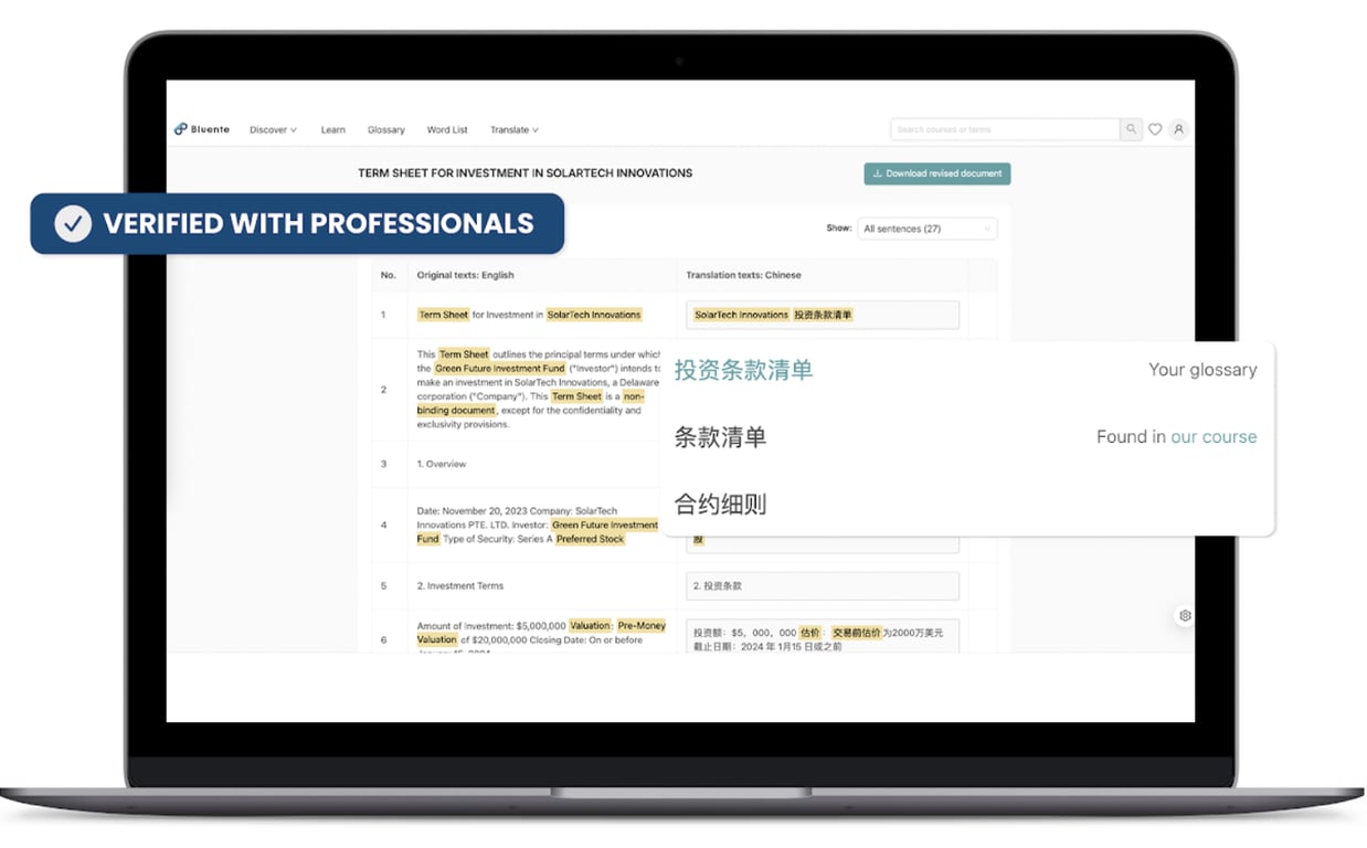 At Bluente, we hope to revolutionize the way professionals communicate and work with one another. This is why we developed a business language learning app as a tool for professionals to master industry terms and conversations in another language, and a document translator tool for professionals to understand foreign language documents and translate documents (presentation slides, PDF contracts etc.) to a client-spoken language.