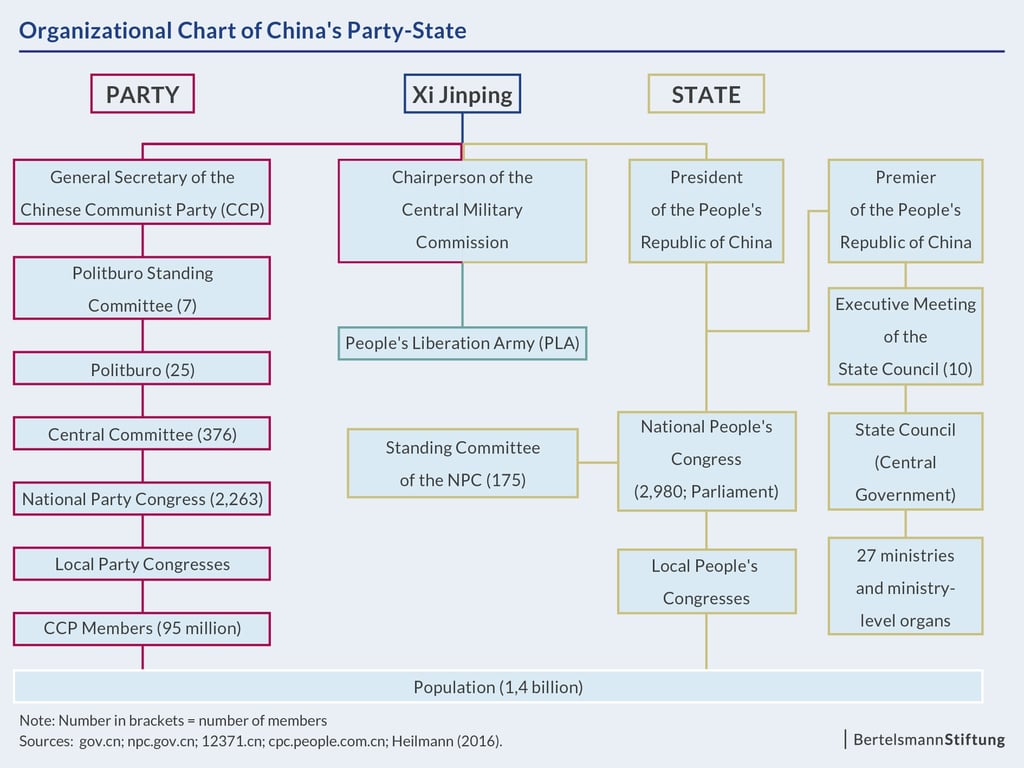 Under the Party State System, CCP is the absolute power centre in Chinese politics. It assumes overall responsibility and coordinates all sides of the government, NPC, CPPCC, and the masses organisations.
