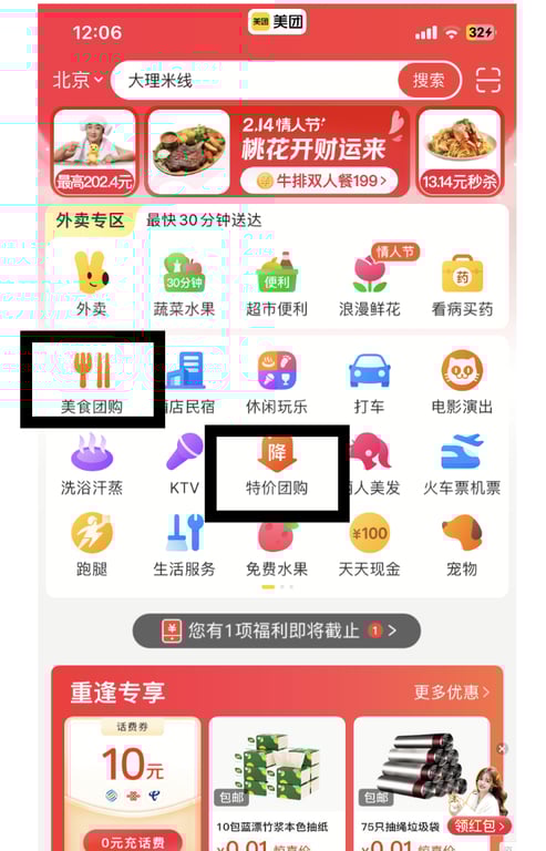 1. Group Buying Deals (团购): Besides food delivery, Meituan also offers group buying deals for restaurants, hotels, and other services (such as beauty services), allowing users to enjoy discounts when they buy in bulk. Click on "特价团购" or "美食团购" on the homepage to check out the group buying deals.