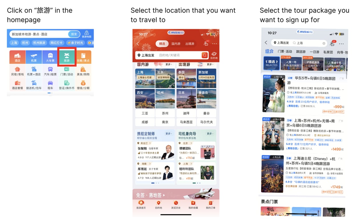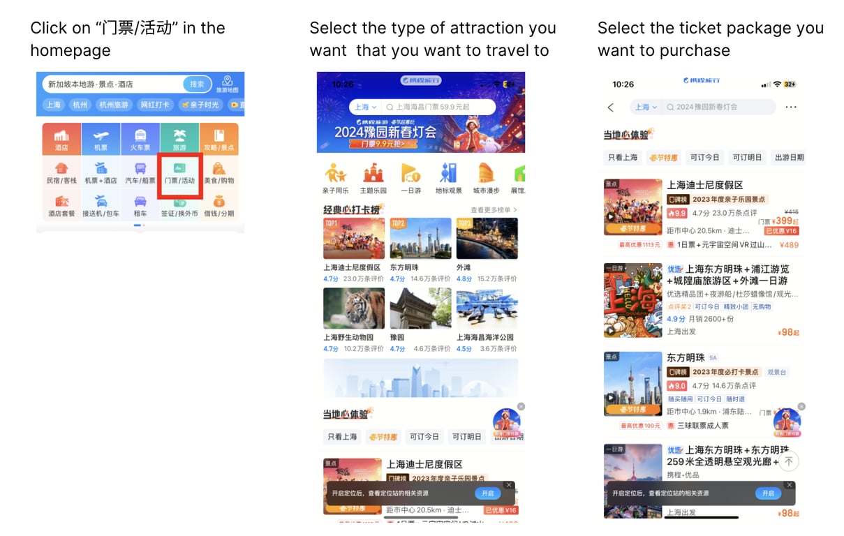 4. Attraction Tickets: Users can purchase tickets for attractions, shows, and tours through Ctrip, often at discounted prices.