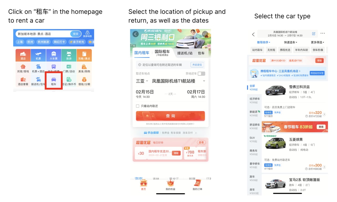 2. Car Rental: Users can rent cars through Ctrip, with options for different car models, rental durations, and pickup/drop-off locations.