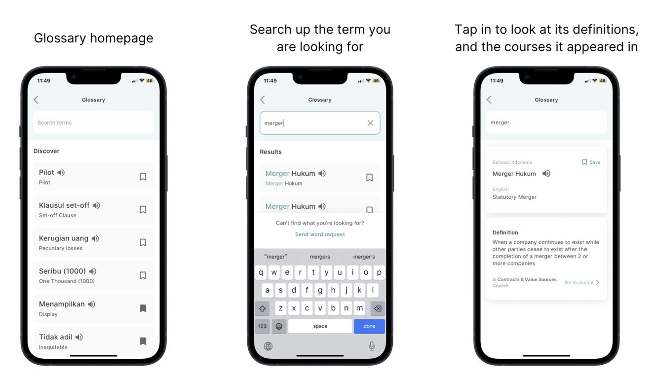 3. Courses for learning industry-specfic terms: The app teaches terms across topics via courses. These courses allow users to learn the times in a bite-sized manner, and also contain practice quizzes for users to test their retention of the terms.