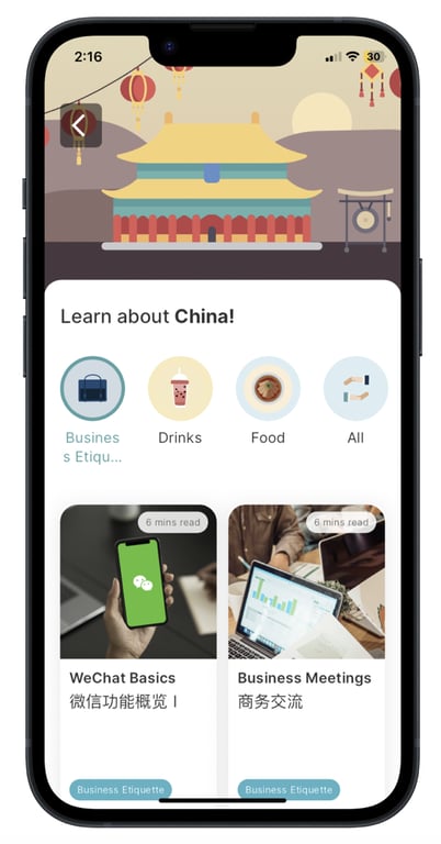 4. Culture articles: Users can take a look at the in-app culture articles which teach business etiquette and the culture of China. This allows users to better understand business and cultural contexts in China.
